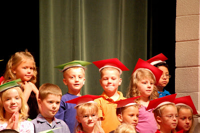 Parker is a big 1st grader now! My how the time flies! On Friday he was given the award of the "Most Respectful". He teacher explained that he is kind to everyone and always raises his hand to ask questions. And rarely, if ever talks and goofs around when he isn't supposed to! Later he told me it was a boring award. We assured him that it was the best award he could have gotten. What is more important than being respectful? After their class graduation we headed to the gym for the program, which was a mad house, with all 7 kindergarten classes and their proud parents. He was adorable and did a great job.